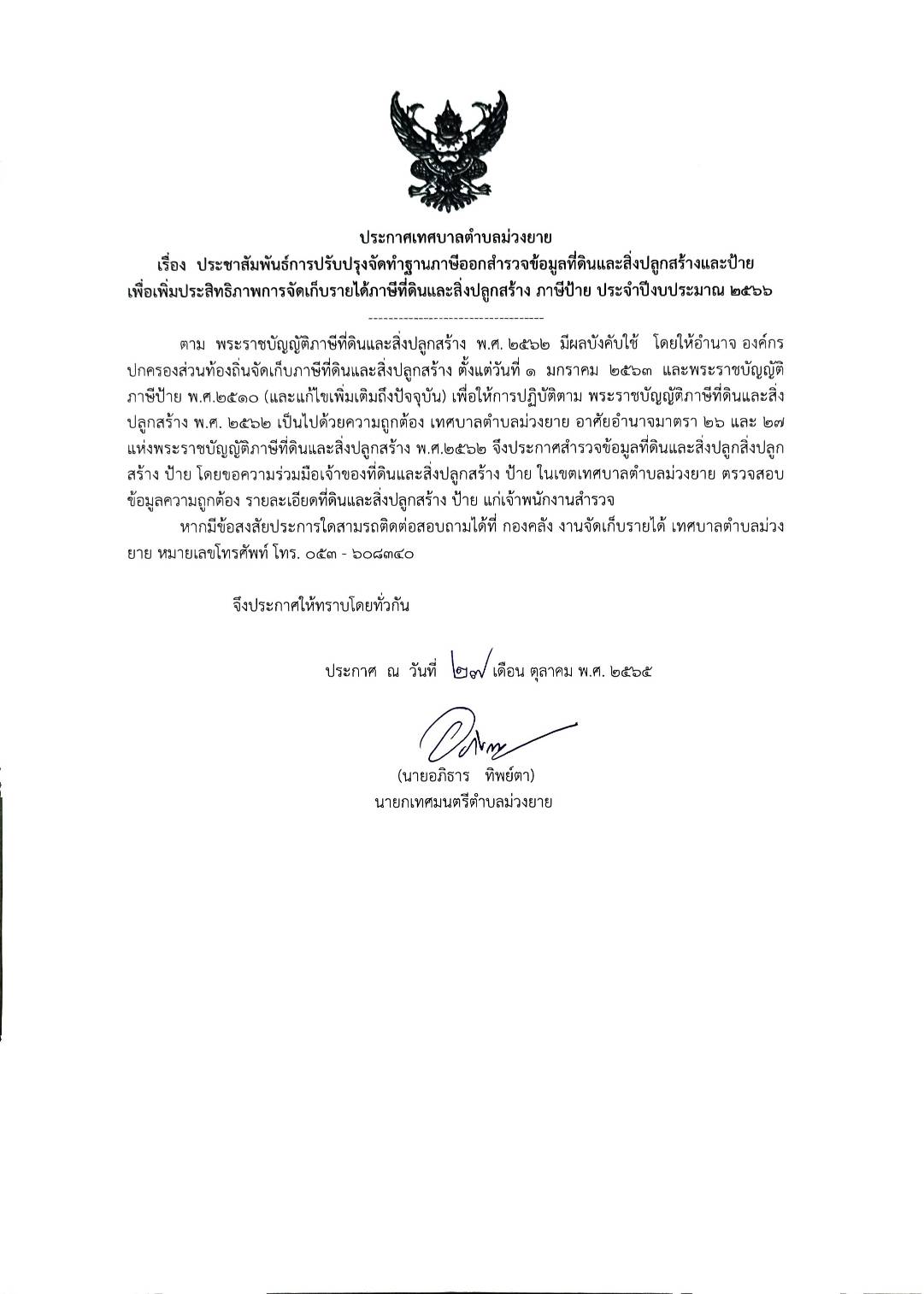 ประกาศประชาสัมพันธ์การปรับปรุงจัดทำฐานภาษีออกสำรวจข้อมูลที่ดินและสิ่งปลูกสร้างและป้ายเพื่อเพิ่มประสิทธิภาพการจัดเก็บรายได้ภาษีที่ดินและสิ่งปลูกสร้างภาษีป้ายประจำปีงบประมาณ 2566