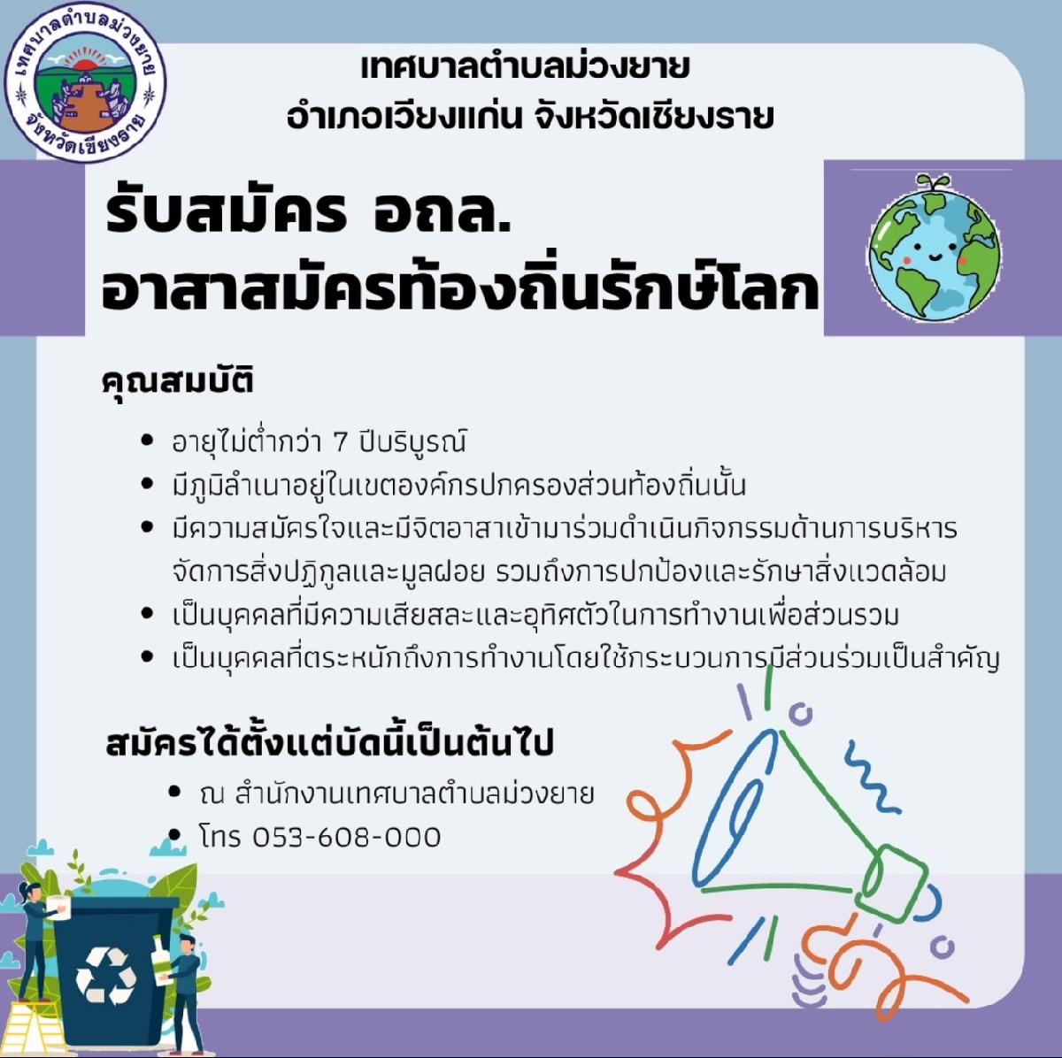 ขอเชิญประชาชนตำบลม่วงยาย สมัครเข้าร่วมโครงการอาสาสมัครท้องถิ่นรักษ์โลก (อสล.)