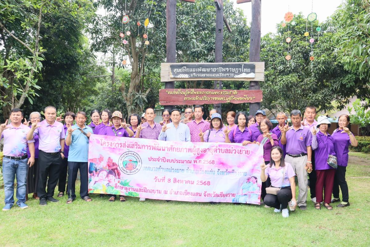 เมื่อวันที่ 8 สิงหาคม 2568 เทศบาลตำบลม่วงยาย โดยงานพัฒนาชุมชน ได้ดำเนินการจัดโครงการส่งเสริมการพัฒนาศักยภาพผู้สูงอายุตำบลม่วงยาย ประจำปีงบประมาณ 2568 กิจกรรมภายใต้โครงการประกอบด้วยการศึกษาดูงานและฝึกอบรม ณ อำเภอเชียงแสน จังหวัดเชียงราย